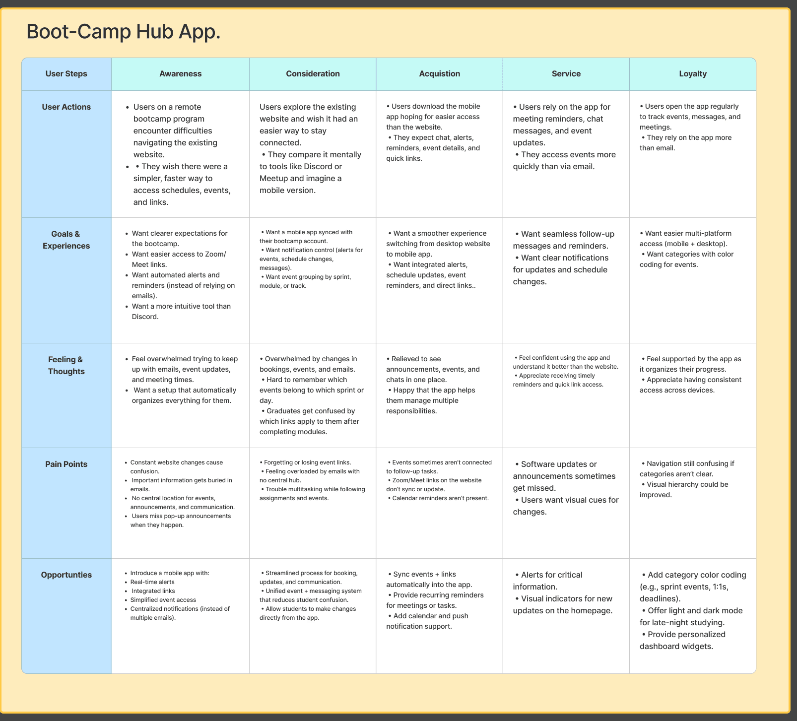 Through this research, I mapped the student journey from awareness to loyalty, identifying key pain points such as: